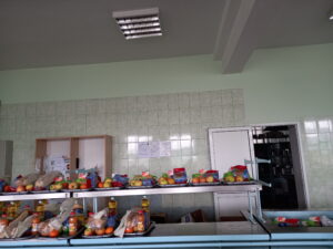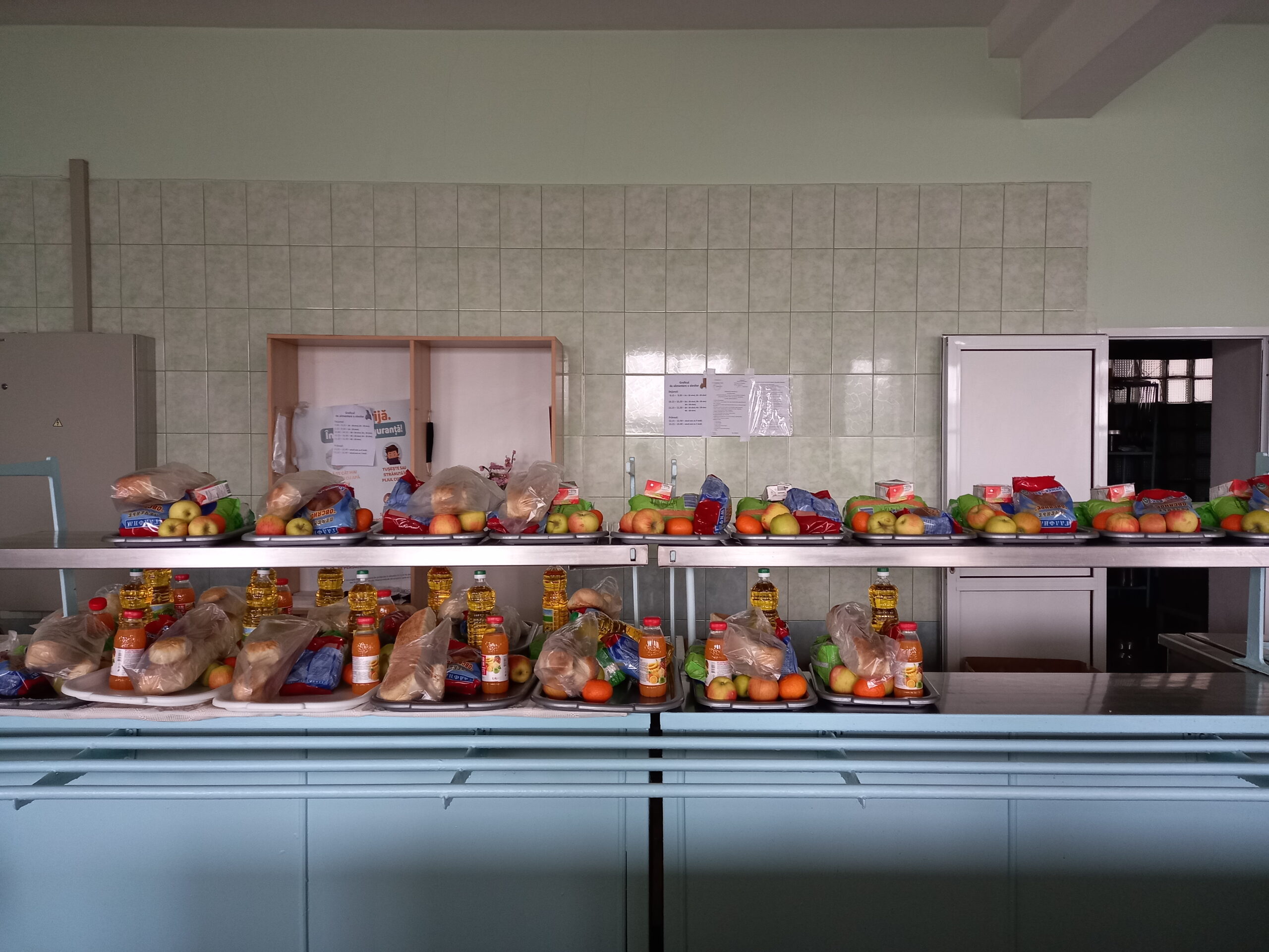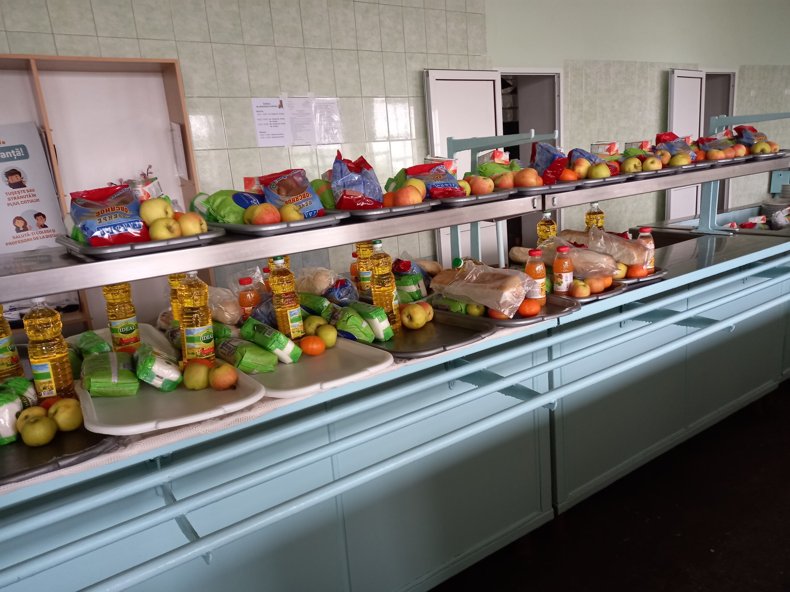 Conținutul pachetelor diferă, deoarece clasele primare (34 elevi) ridică produse alimentare – dejun plus prânz, iar elevii din ciclul gimnazial (16 elevi), doar dejunul.