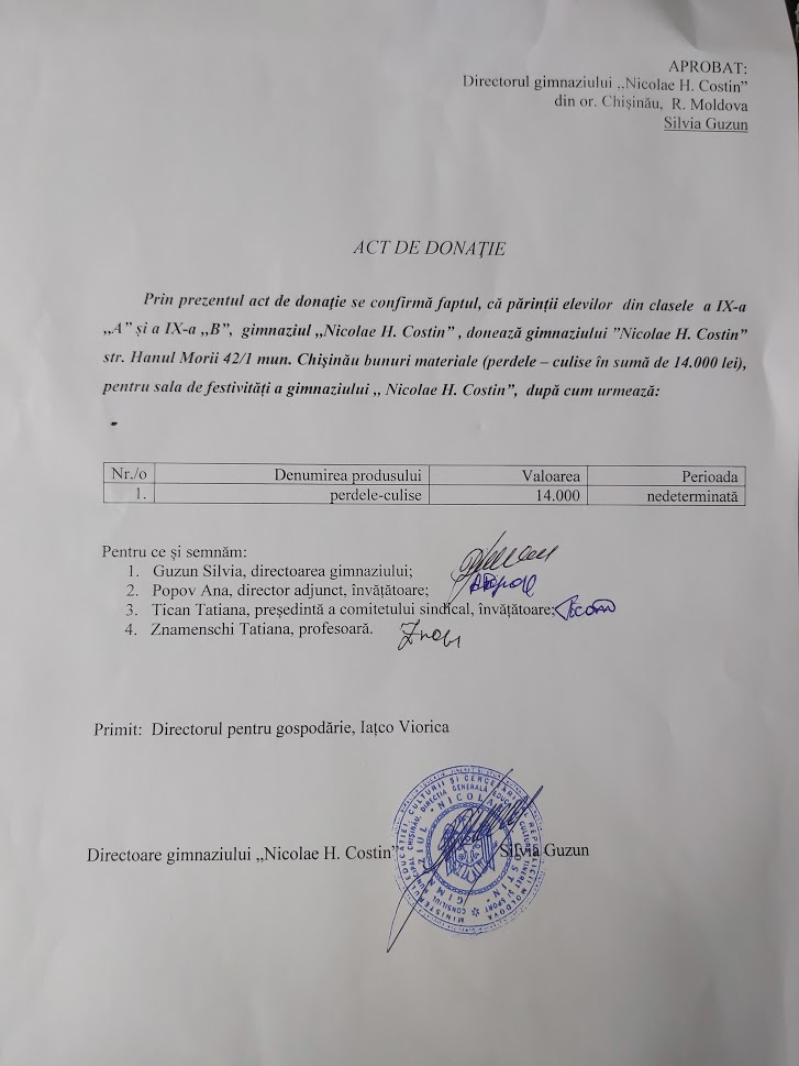Mulțumim părinților pentru buna colaborare și pentru donația oferită, culise pentru sala de festivități. Le includem în patrimoniul instituției noastre prin Actul de donație.